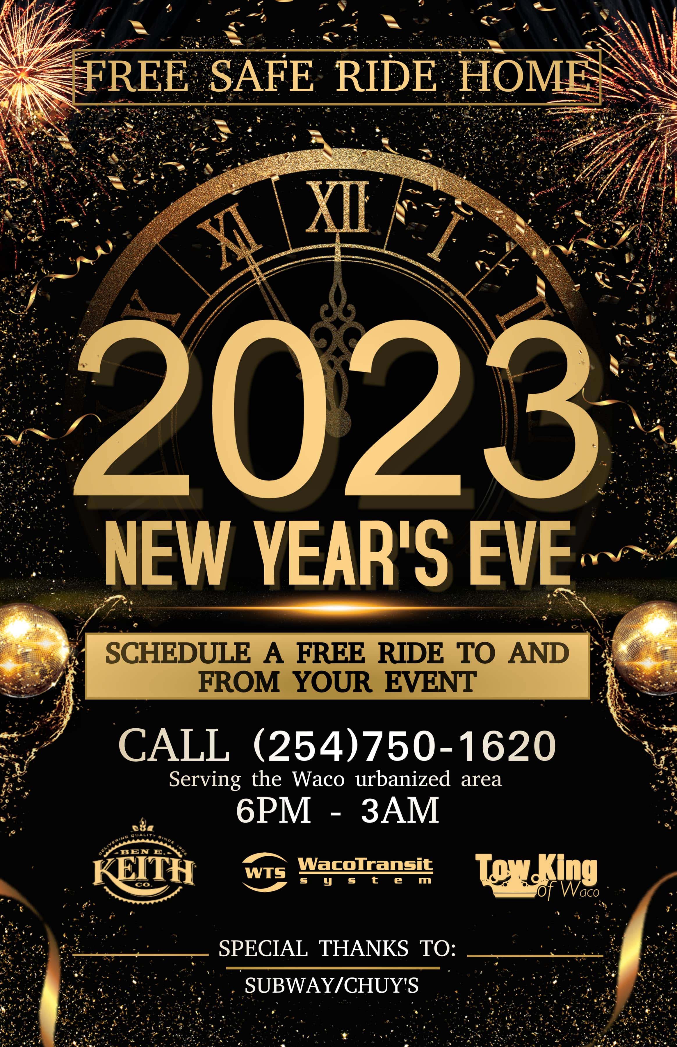 free rides new year’s eve 2023 – New Year’s Eve Holiday Service. Las Vegas New Years Eve 2022 2023 | LasVegasHowTo.com. Waco Convention & Visitors Bureau | Waco TX. New Years San Francisco 2022/2023 | SF Events & Entertainment. City of Waco, Texas on Twitter: “Celebrating this New Year’s Eve . Free Milwaukee routes to use if you need a ride to the bars on Dec. 31. City of Waco, Texas on Twitter: “Celebrating this New Year’s Eve . DART, TRE offer free rides on New Year’s Eve to help people . County buses are free on New Year’s Eve. Here are the routes to .